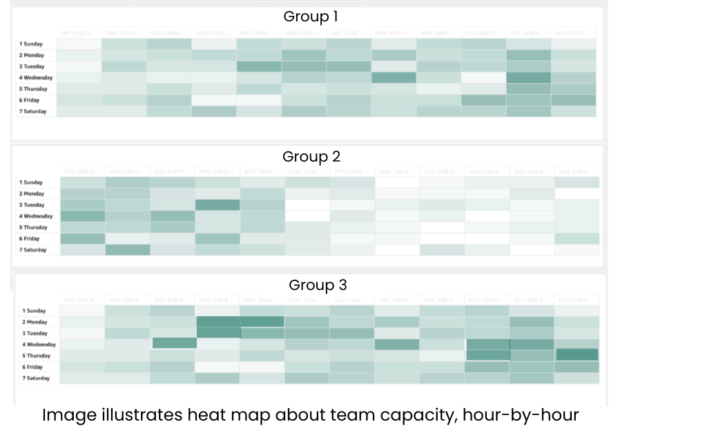 The data quickly surfaced imbalances—some teams were consistently operating at full capacity, while others had significant idle time. Heat maps highlight which pods were overextended and which were underutilized.